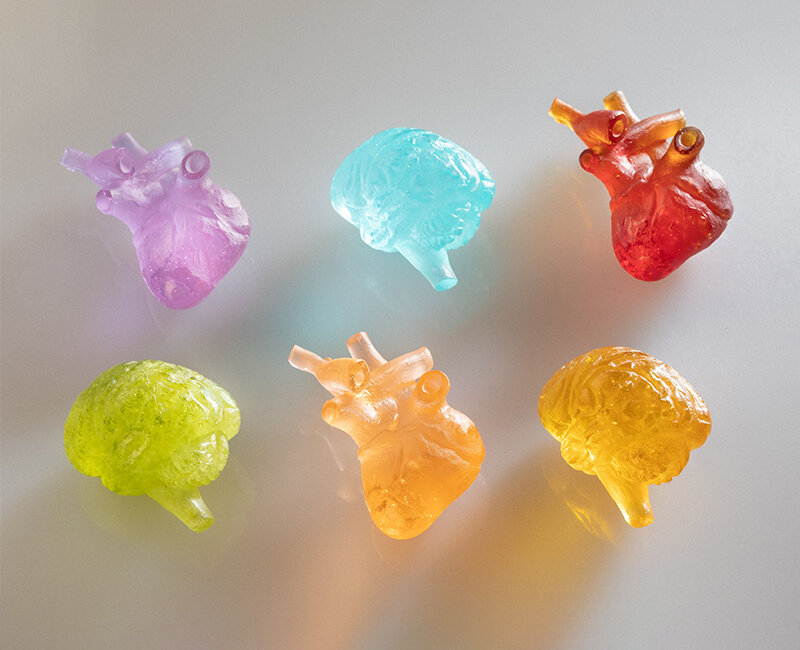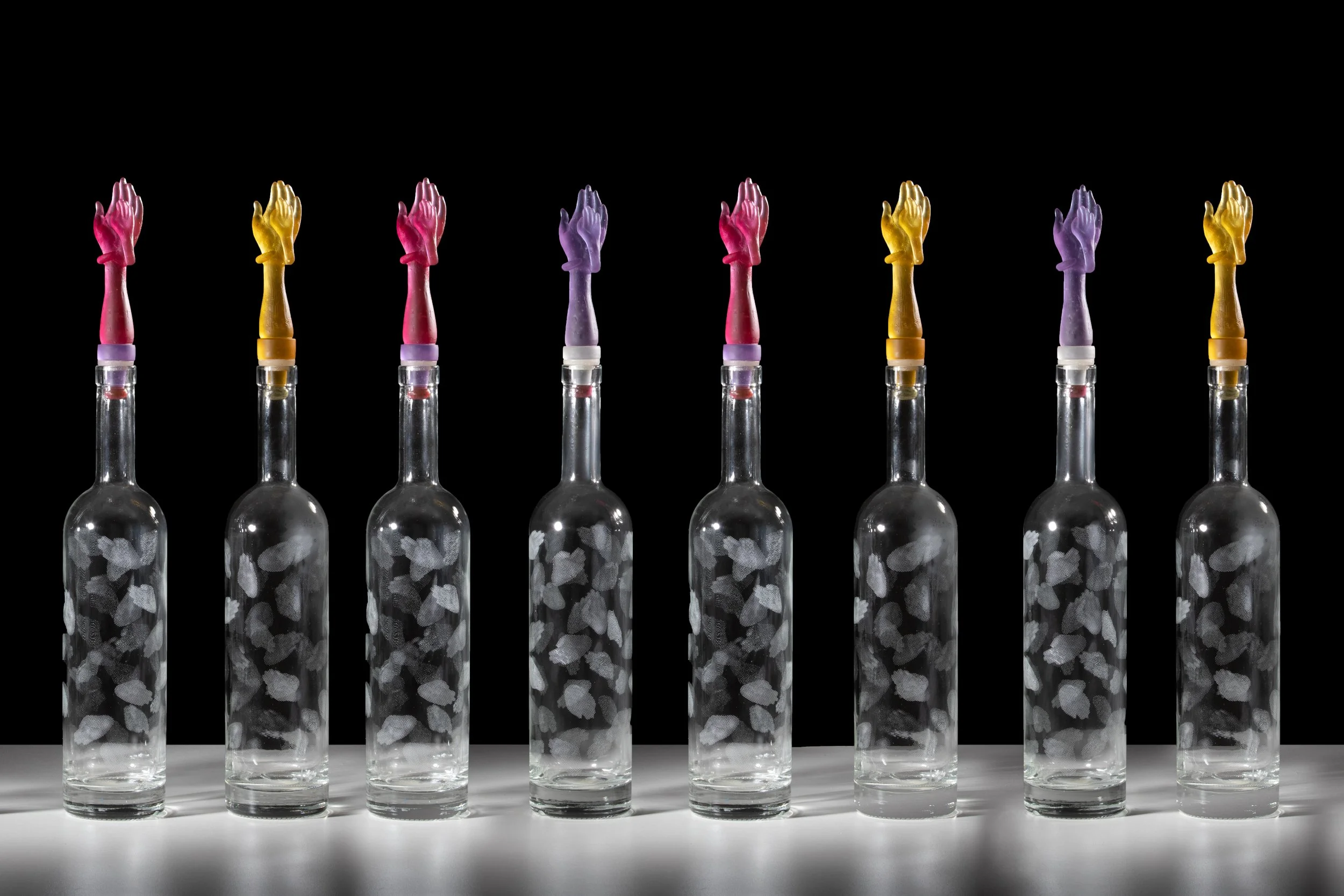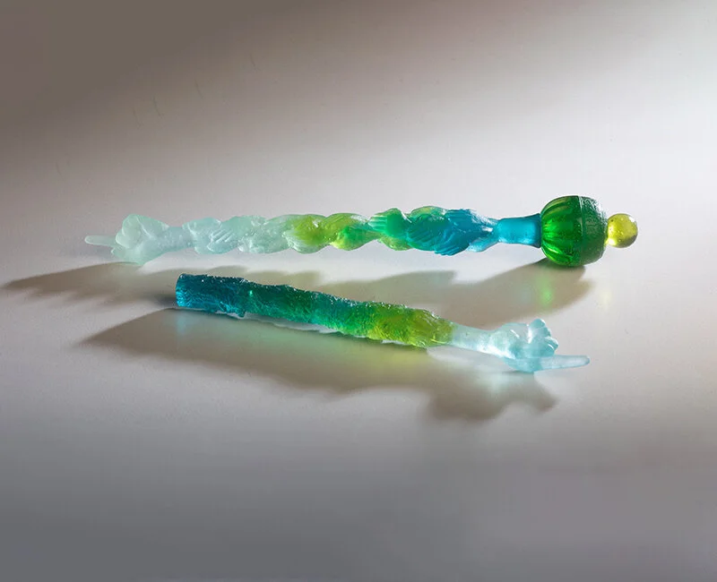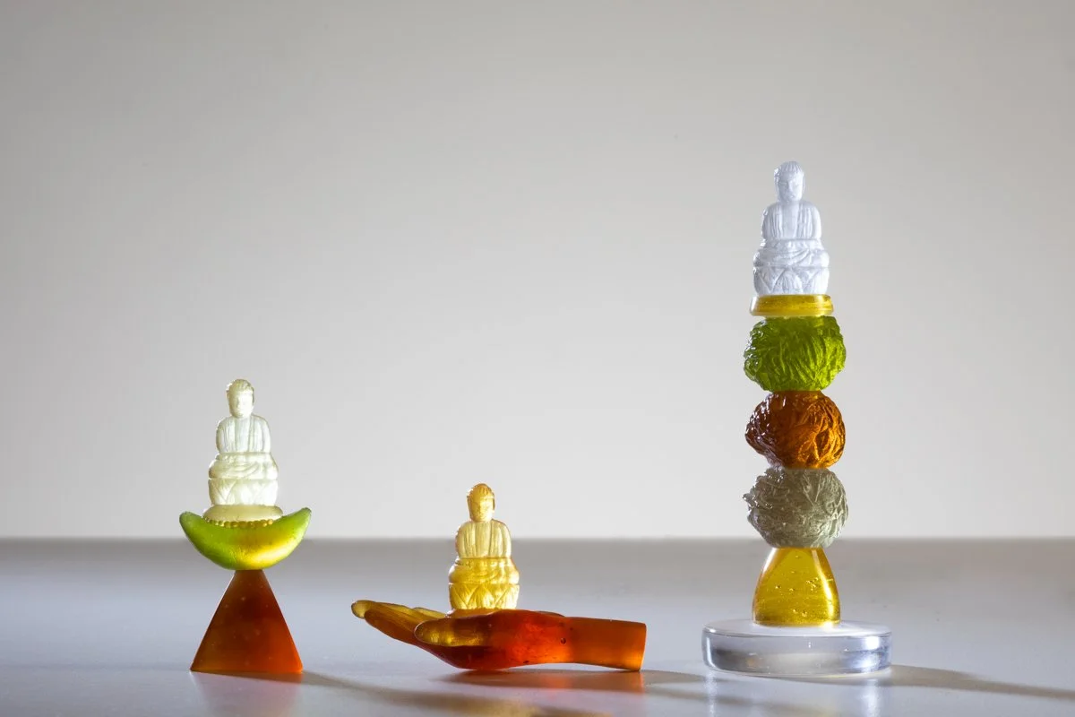 Pate de Verity is a pun on “pate de verre” which refers to a glass casting technique coined in late 19th C. France. This process is defined by the selective placement of colored glass particles into mold recesses, that when melted in a kiln result in a translucent glass form.