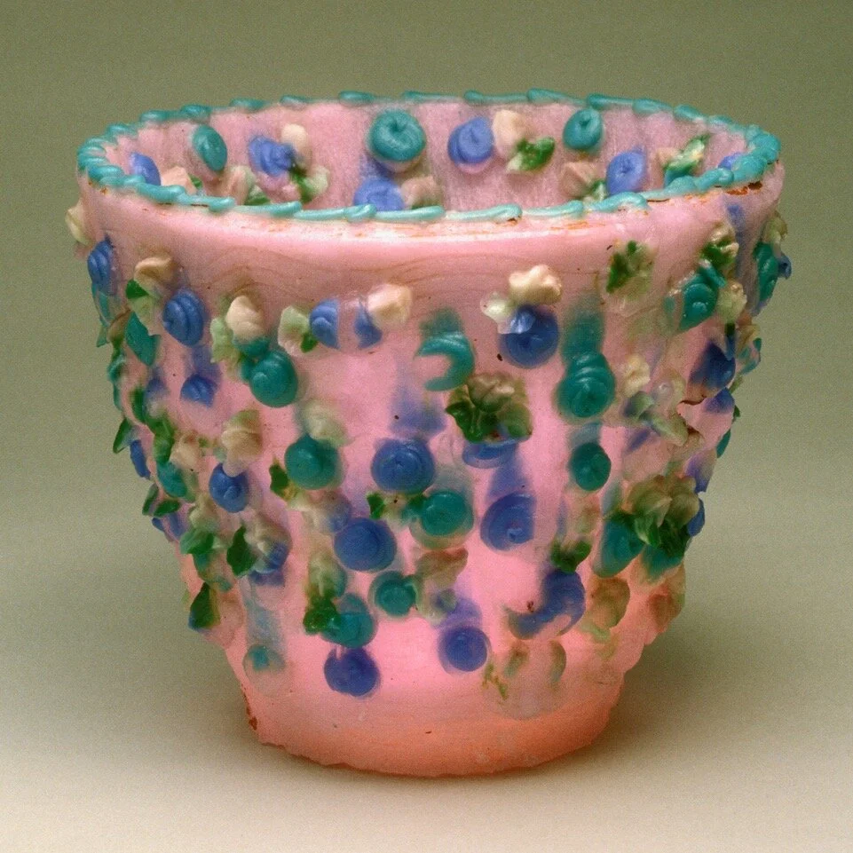 In the 80s and 90s I began using my pastry skills, including casting from chocolate and maple sugar molds to create cake-like vessels from glass. Notice some of my early pate de verre work that was made by piping liquid chalk from a pastry bag.